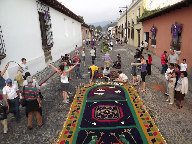 alfombra. We had one last bit of sawdust to dye hot pink, which we quickly finished up around breakfast. Milady had many conversations with the police and city maintenance workers in order to nail down a specific start time for when the road on the side of Casa Herrera would be closed. That road in particular is one of the main roads into Antigua from Guatemala City, meaning it wouldn't be closed until much later than we anticipated, at least that's what we were initially told...